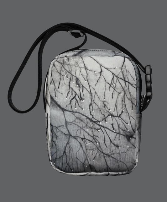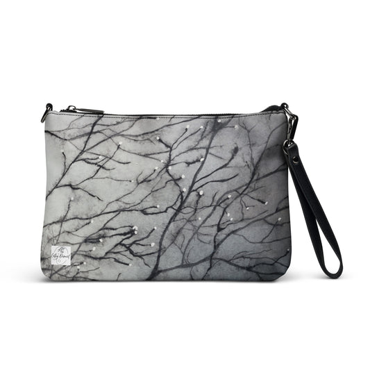 Crossbody Bag - Tranquil Dawn Misty Morning, Serene Tree Branches with Dew Drops Design by Cathy Dement, Interchangeable Wrist Strap