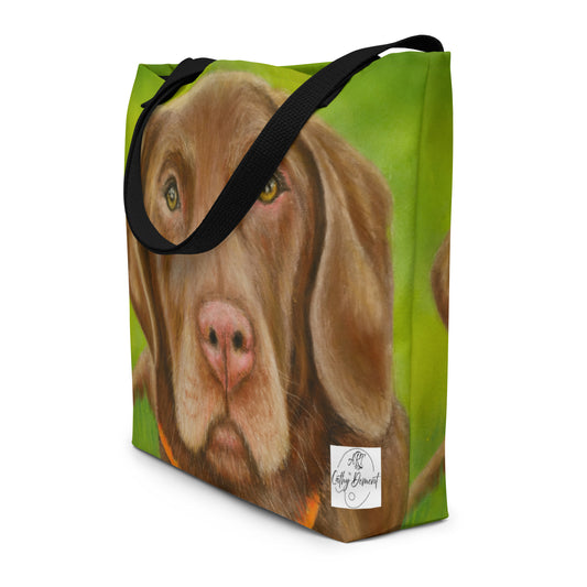 Large Tote Bag With Pocket - Chocolate Lab Dog Portrait, Artwork By Cathy Dement