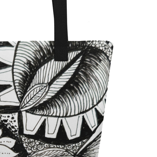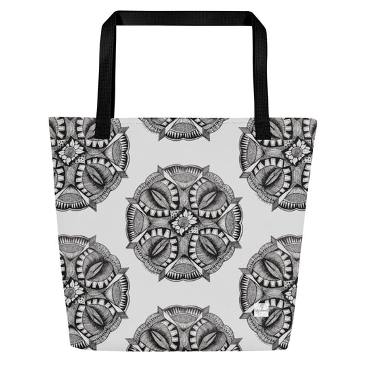 Large Tote Bag with Pocket - Zen-dala, Monochrome Zentangle, Floral Artwork Design