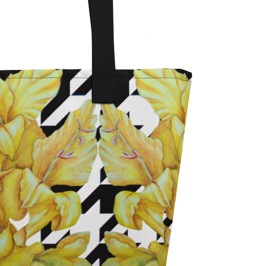Large Tote Bag with Pocket: Hounds Tooth Pattern With Yellow Gladiola Artwork Design by Cathy Dement, 16x20 Inches