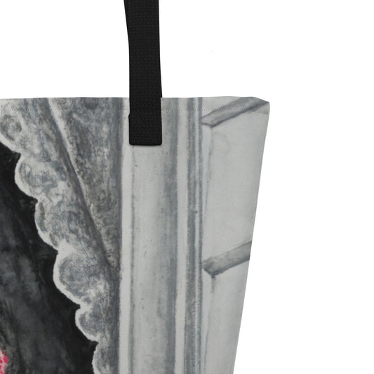 Large Tote Bag with Pocket: Stavanger Bloom Monochrome Window Portrait with Pink Flower Artwork Design by Cathy Dement, 16x20 Inches