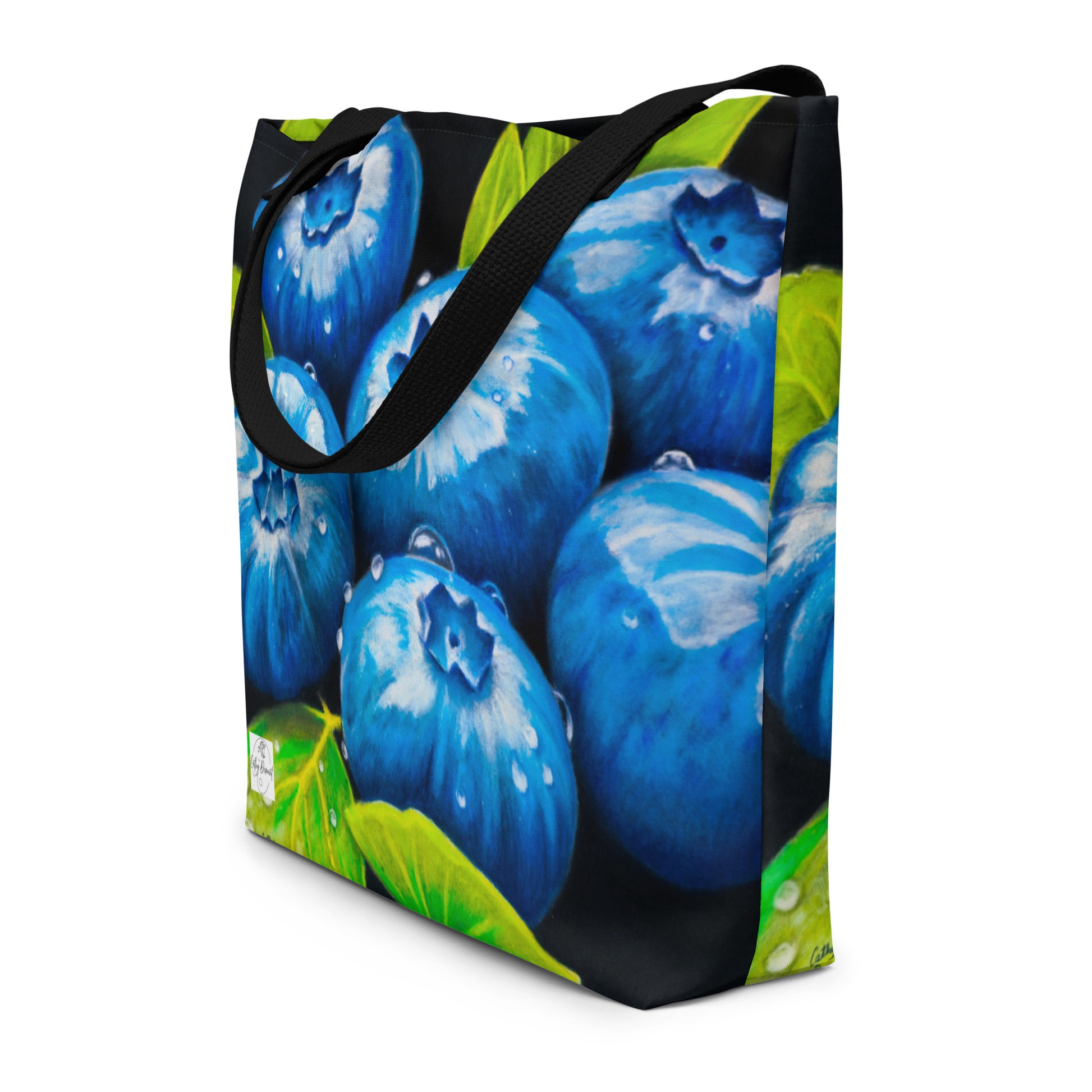 Large Tote Bag with Pocket - Blueberry Bliss - Berry Artwork with Dew Drops