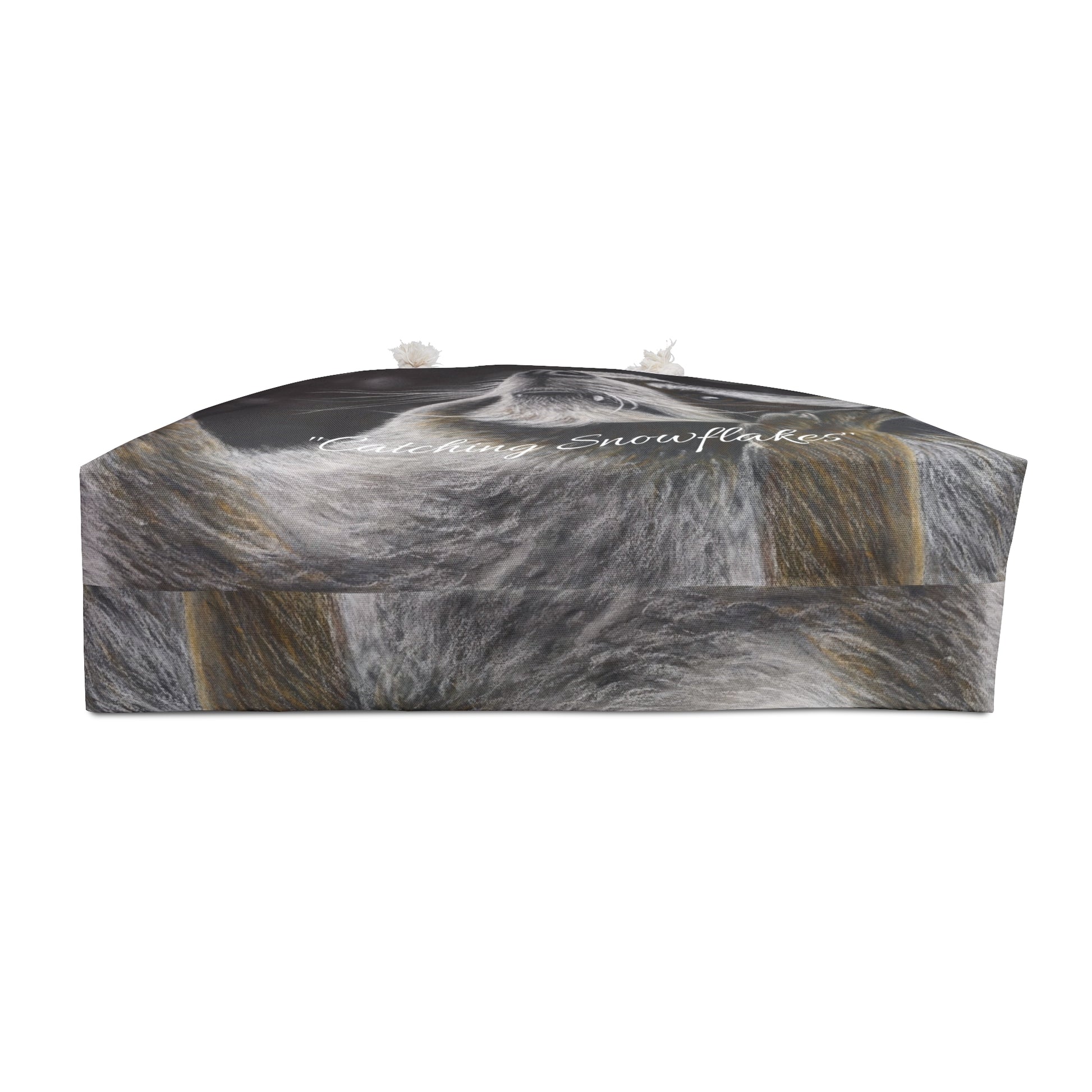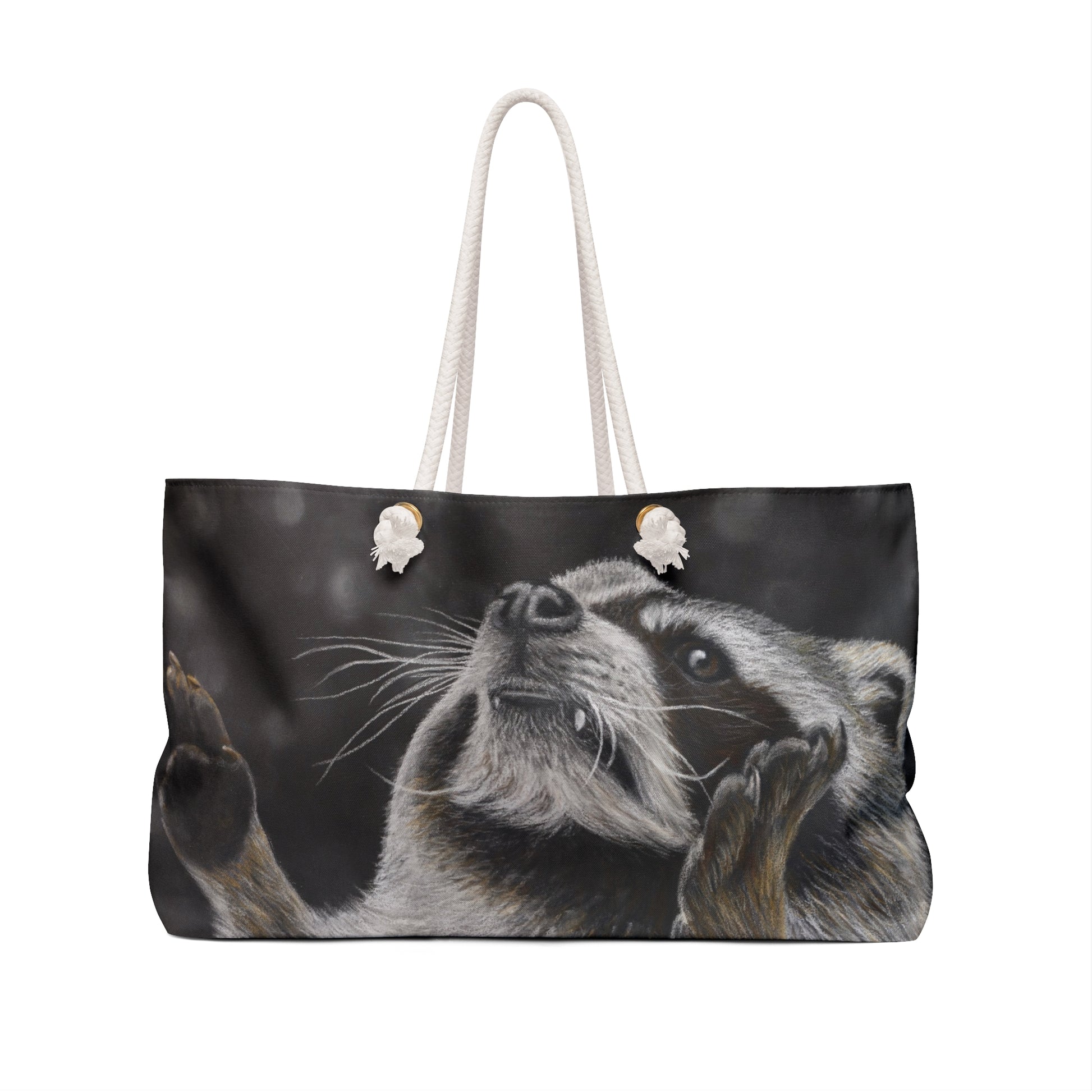 This oversized Weekender Tote features my original pastel painting of a cute raccoon, holding his paws up, as if trying to catch snowflakes that are falling from the sky. It is perfect for your weekend at the beach or in town. The wide-mouthed, durable bag holds a generous amount of personal items and is easily held by its thick rope handles.
