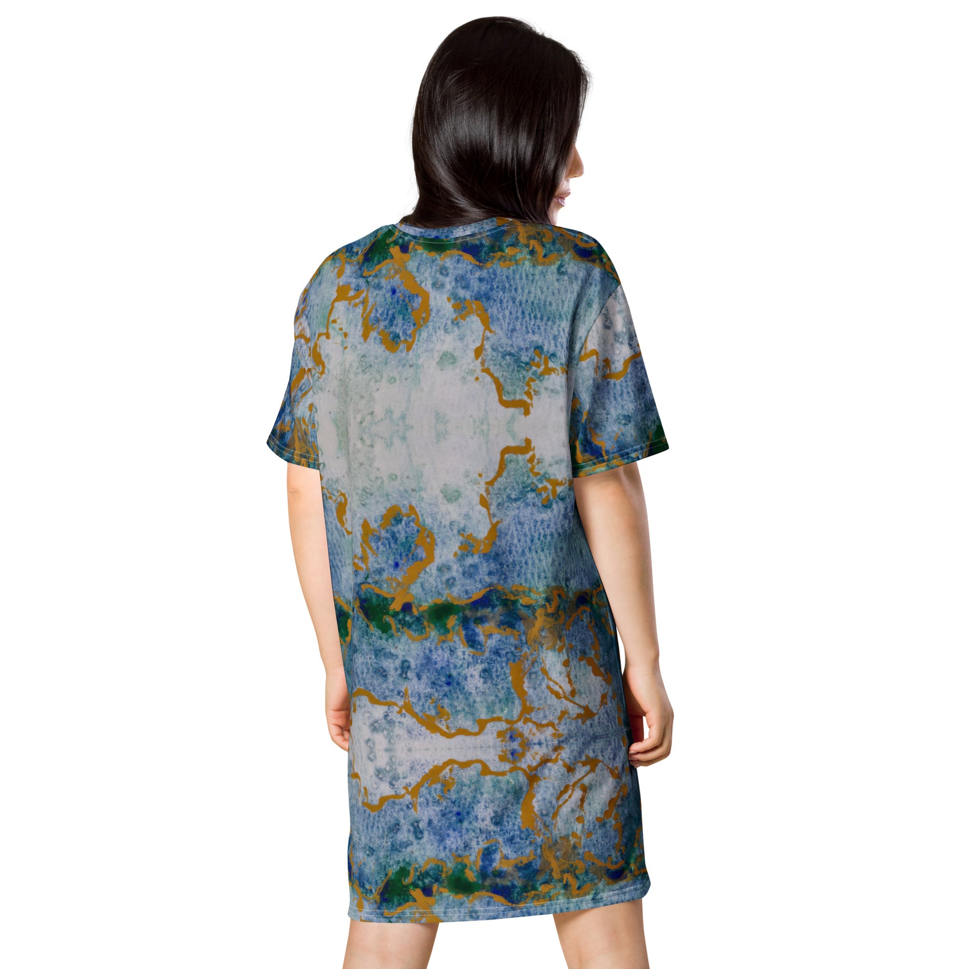 Elevate your wardrobe with the "Celestial Dreamscape" T-Shirt Dress, featuring an exquisite abstract watercolor painting by Cathy Dement. This dress showcases a stunning blend of blue and green hues accented with gold lines on a white background, bringing an ethereal touch to your style. Made from soft, high-quality fabric, it combines comfort and elegance, perfect for any occasion. Discover more unique designs at artrxbycathydement.com and express your artistic flair with this beautiful dress.