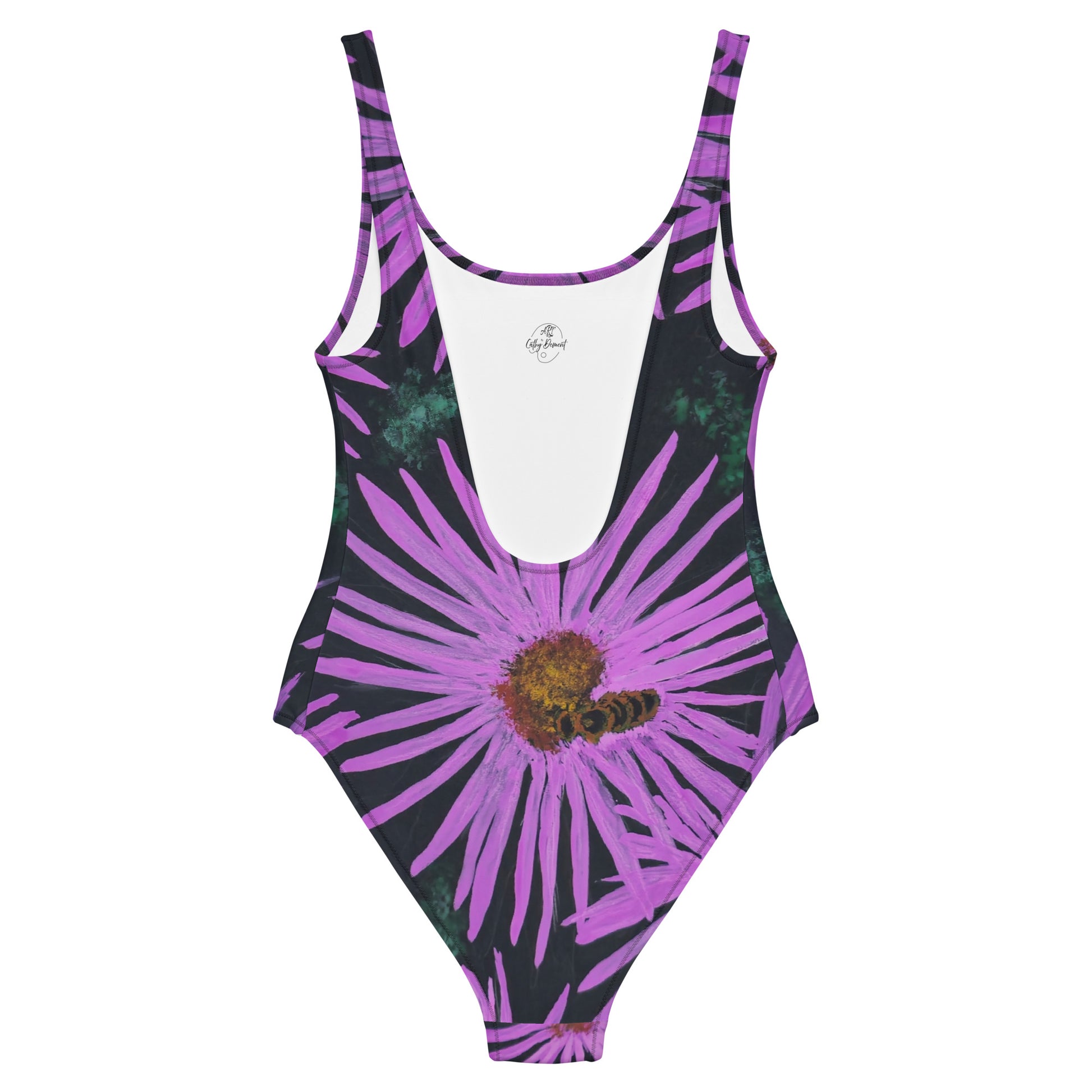 One-Piece Swimsuit -Purple Aster Flower with Bee - Colorful Floral Artwork Design