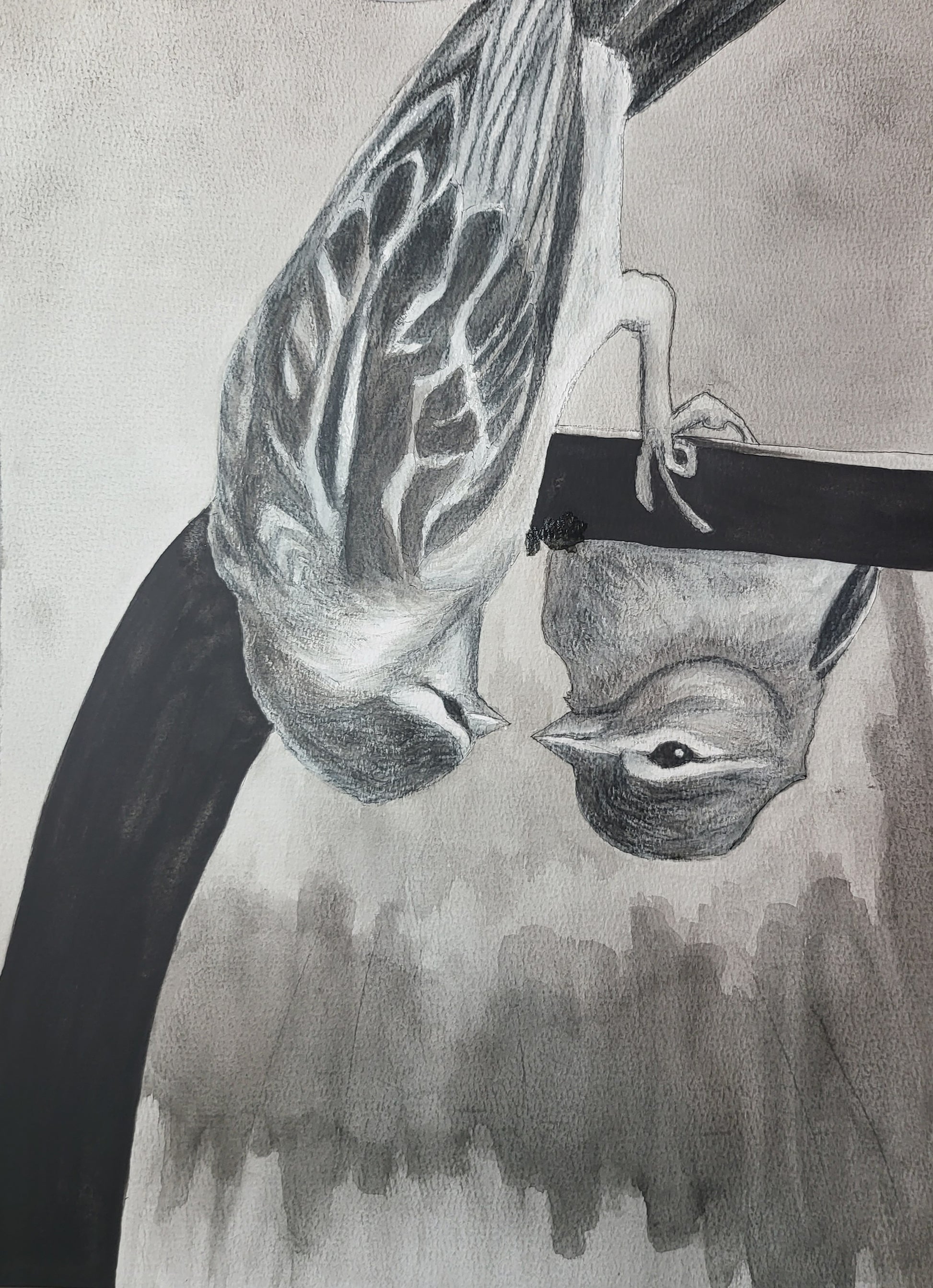 Such a cute little guy (or gal)! This is a watercolor painting of a little bird checking himself out in a rearview mirror. It measures 11"x15".