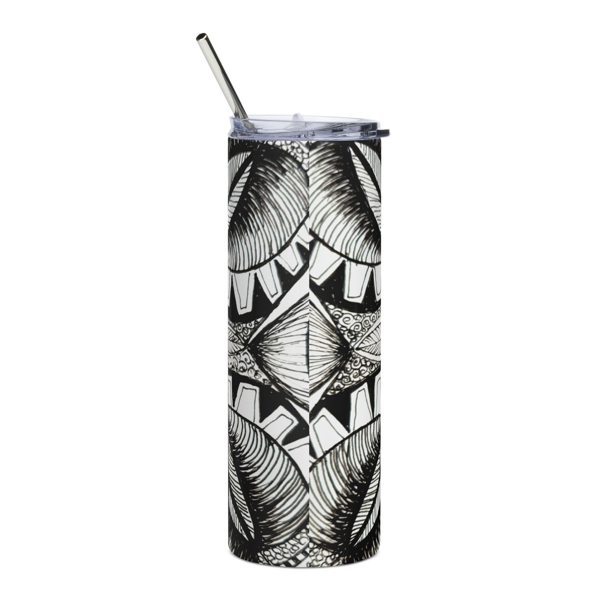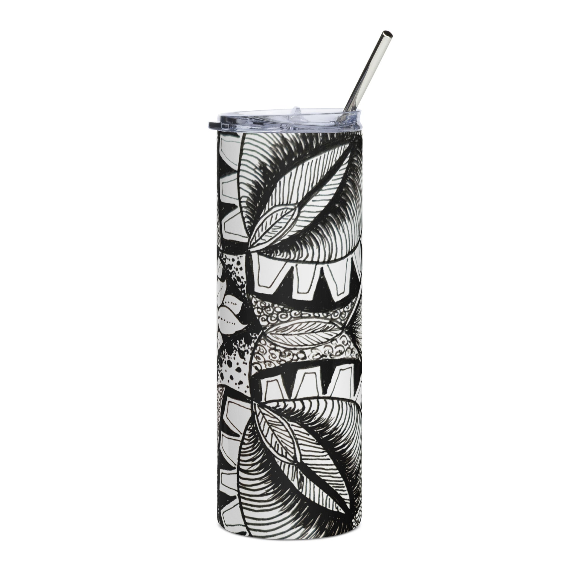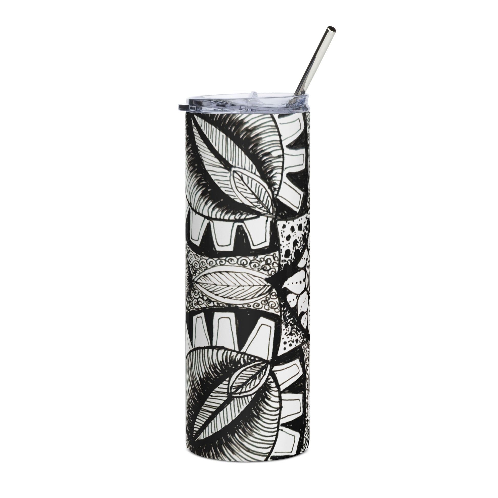 Stainless Steel Tumbler - Zen-dala, Monochrome Zentangle Floral Artwork, 20 Oz Cup with Straw and Lid