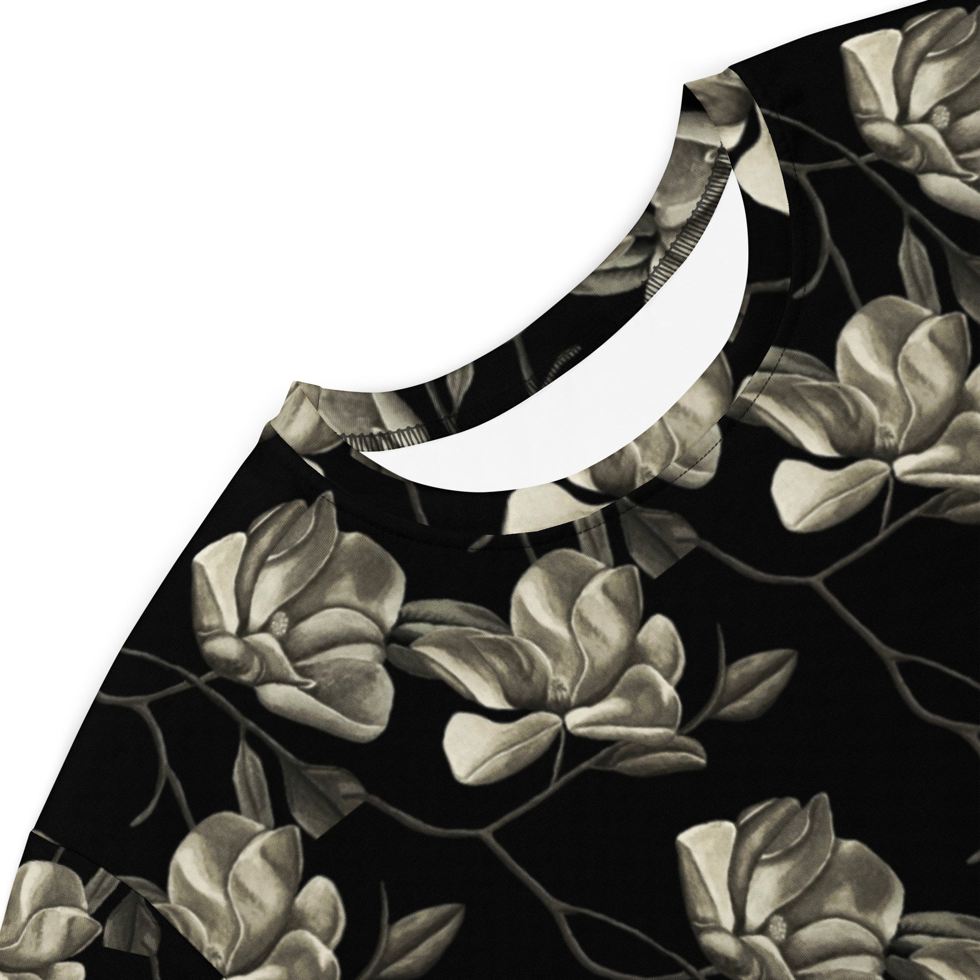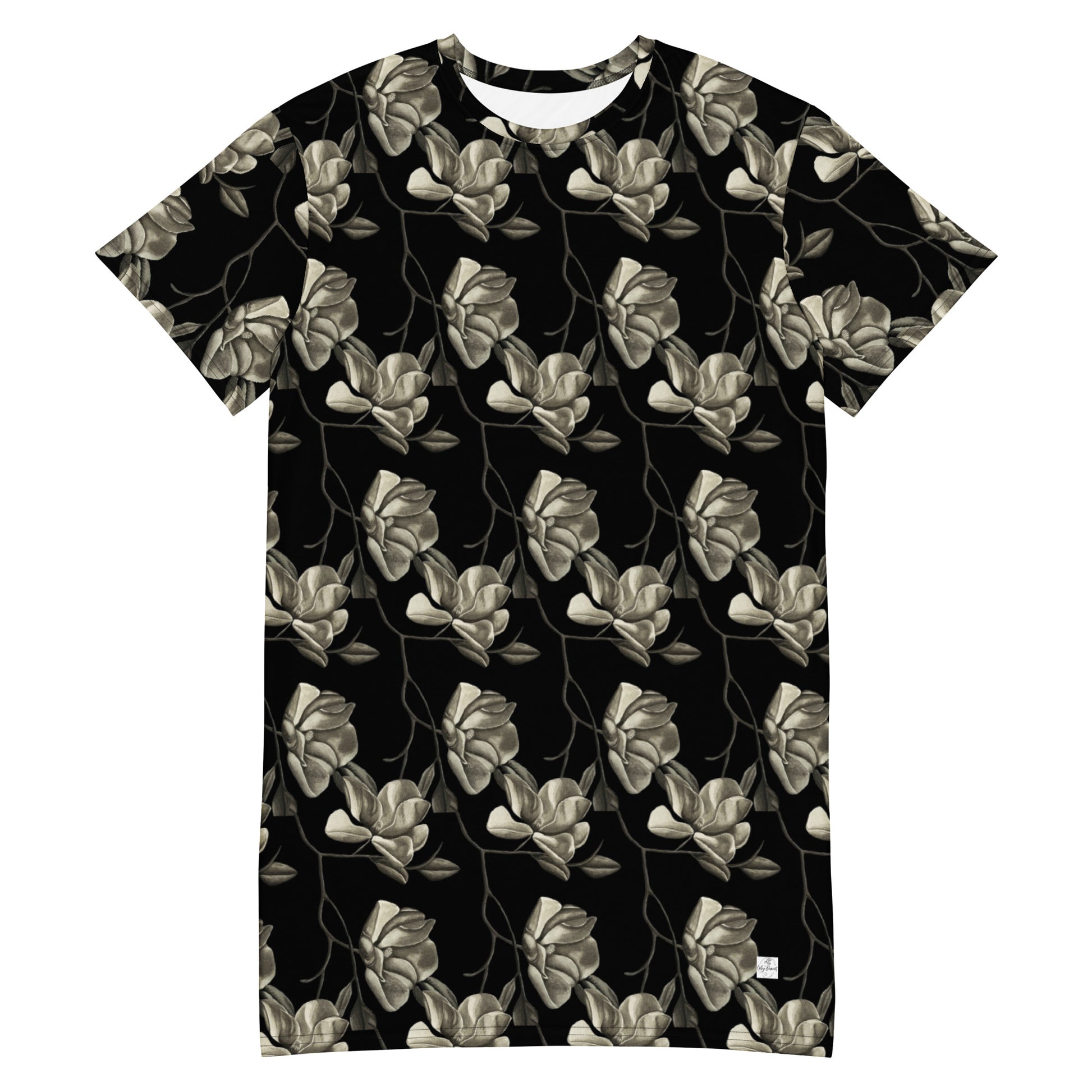 Introducing the ultimate T-shirt Dress - Midnight Magnolias! With its Monochrome Black and White Magnolia Artwork Design by Cathy Dement, this dress is a versatile piece that can be dressed up or down for any occasion. Dress it up with a jacket or keep it cool and casual with sneakers. You can even rock it as a nightie or incorporate it into your street style look. The oversized fit is not only comfortable but also stylish, proving that comfy can be cool!