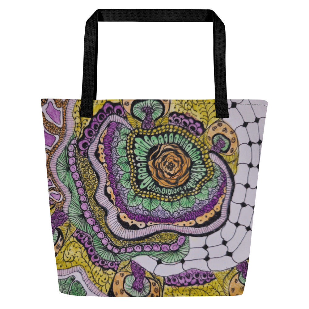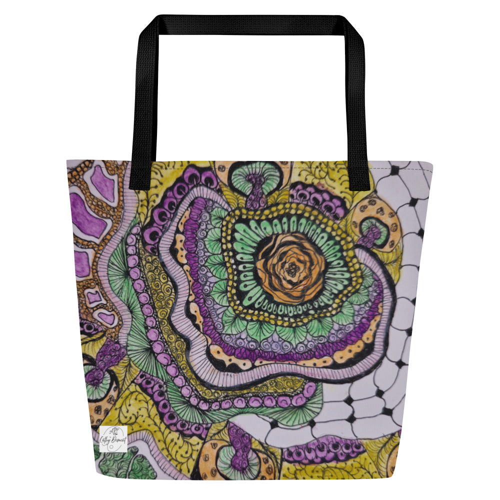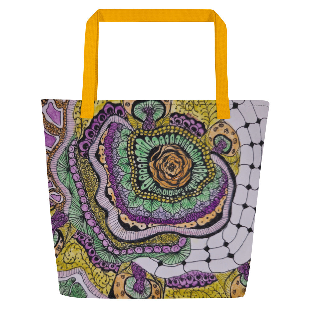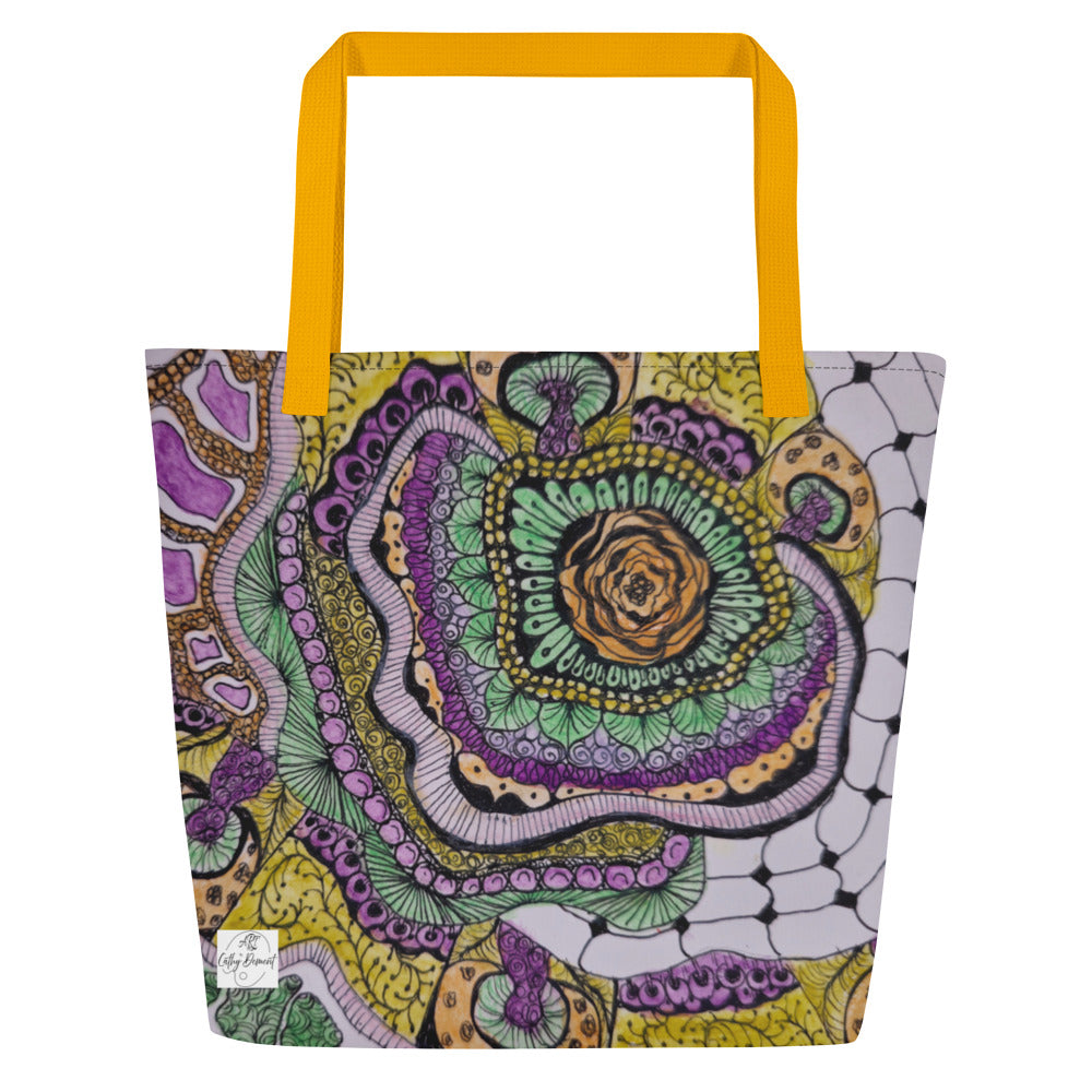 Carry a piece of art with you with the Zen Floral Bliss Tote Bag, showcasing Cathy Dement's intricate Floral Zentangle Artwork Design. This spacious tote, measuring 16x20 inches, is made from 100% polyester and features a convenient inside pocket for added storage. The comfortable cotton webbing handles ensure easy carrying, and the vibrant, fade-resistant colors guarantee long-lasting beauty. Perfect for everyday use or as a special gift, this bag combines practicality with artistic elegance. This bag is available with black or yellow handles!