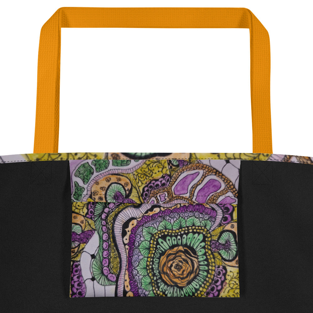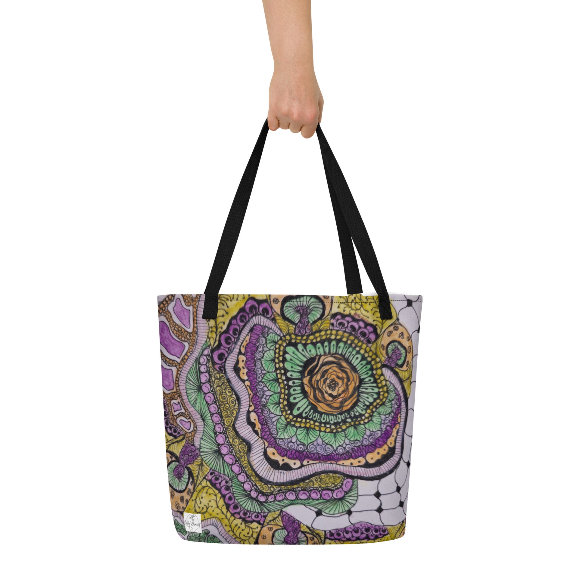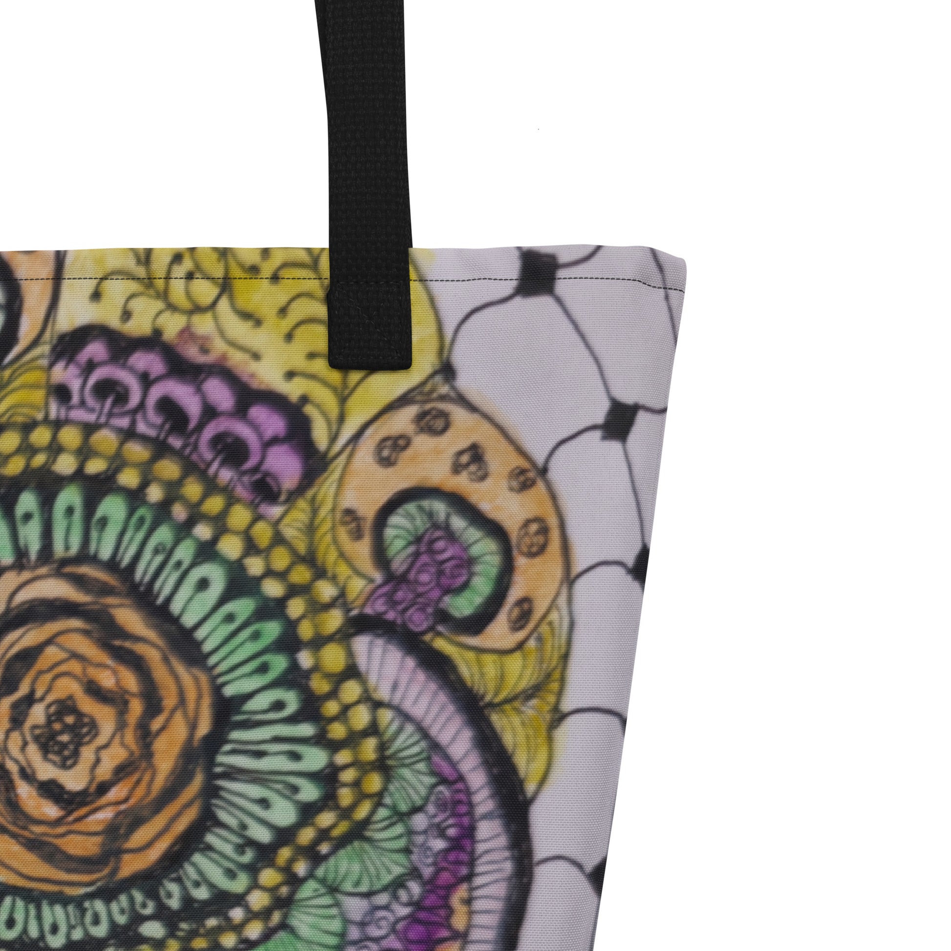 Carry a piece of art with you with the Zen Floral Bliss Tote Bag, showcasing Cathy Dement's intricate Floral Zentangle Artwork Design. This spacious tote, measuring 16x20 inches, is made from 100% polyester and features a convenient inside pocket for added storage. The comfortable cotton webbing handles ensure easy carrying, and the vibrant, fade-resistant colors guarantee long-lasting beauty. Perfect for everyday use or as a special gift, this bag combines practicality with artistic elegance. This bag is available with black or yellow handles!