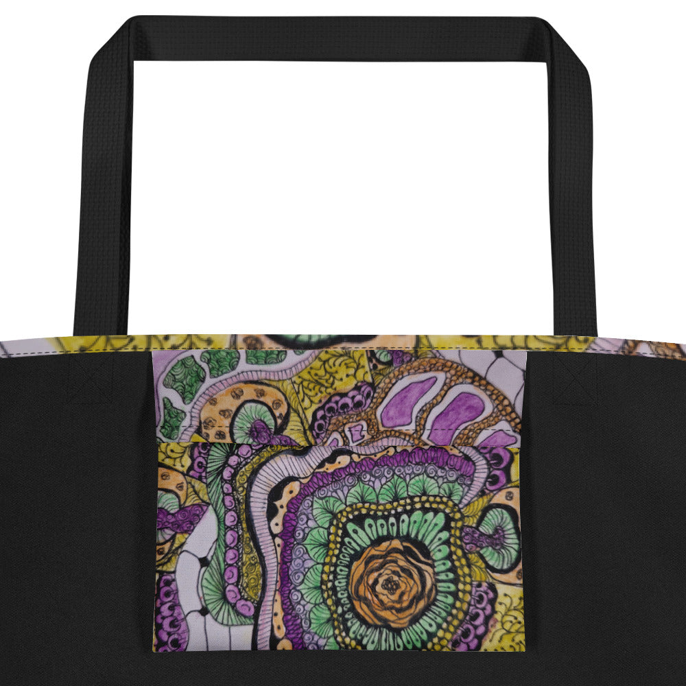 Large Tote Bag with Pocket: Zen Floral Bliss - Floral Zentangle Artwork Design by Cathy Dement, 16x20 Inches