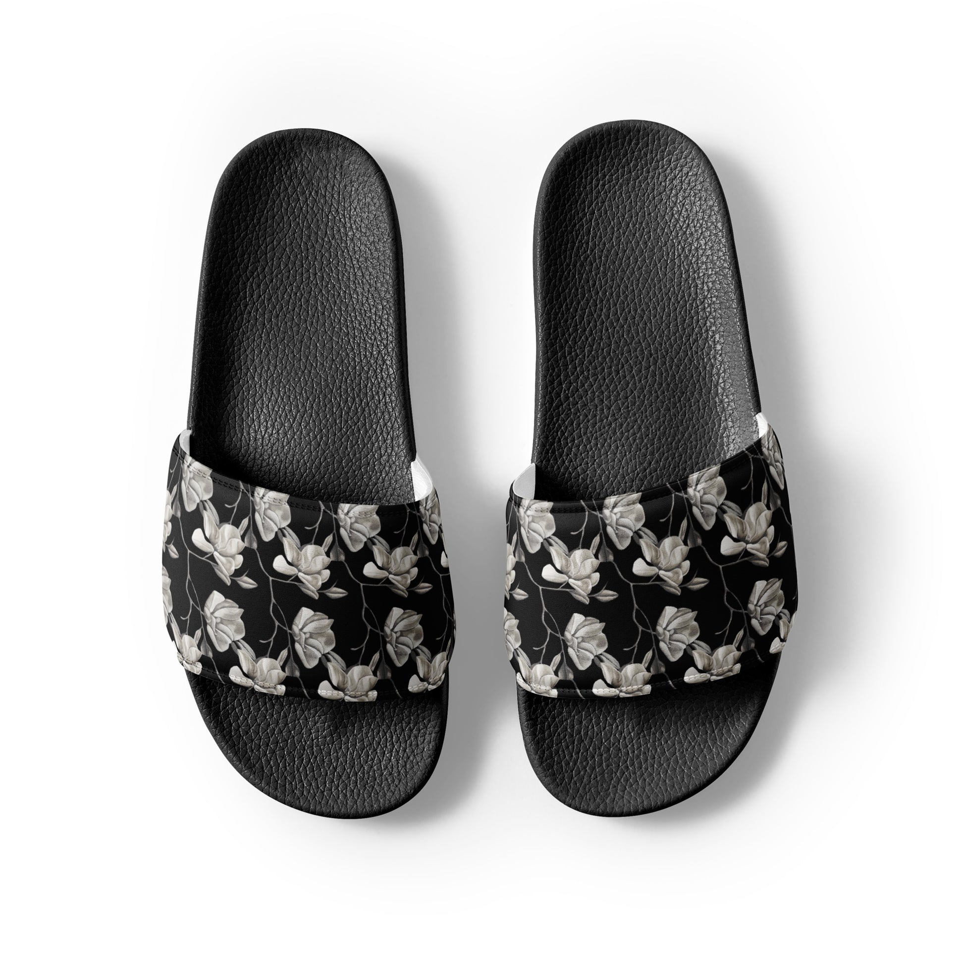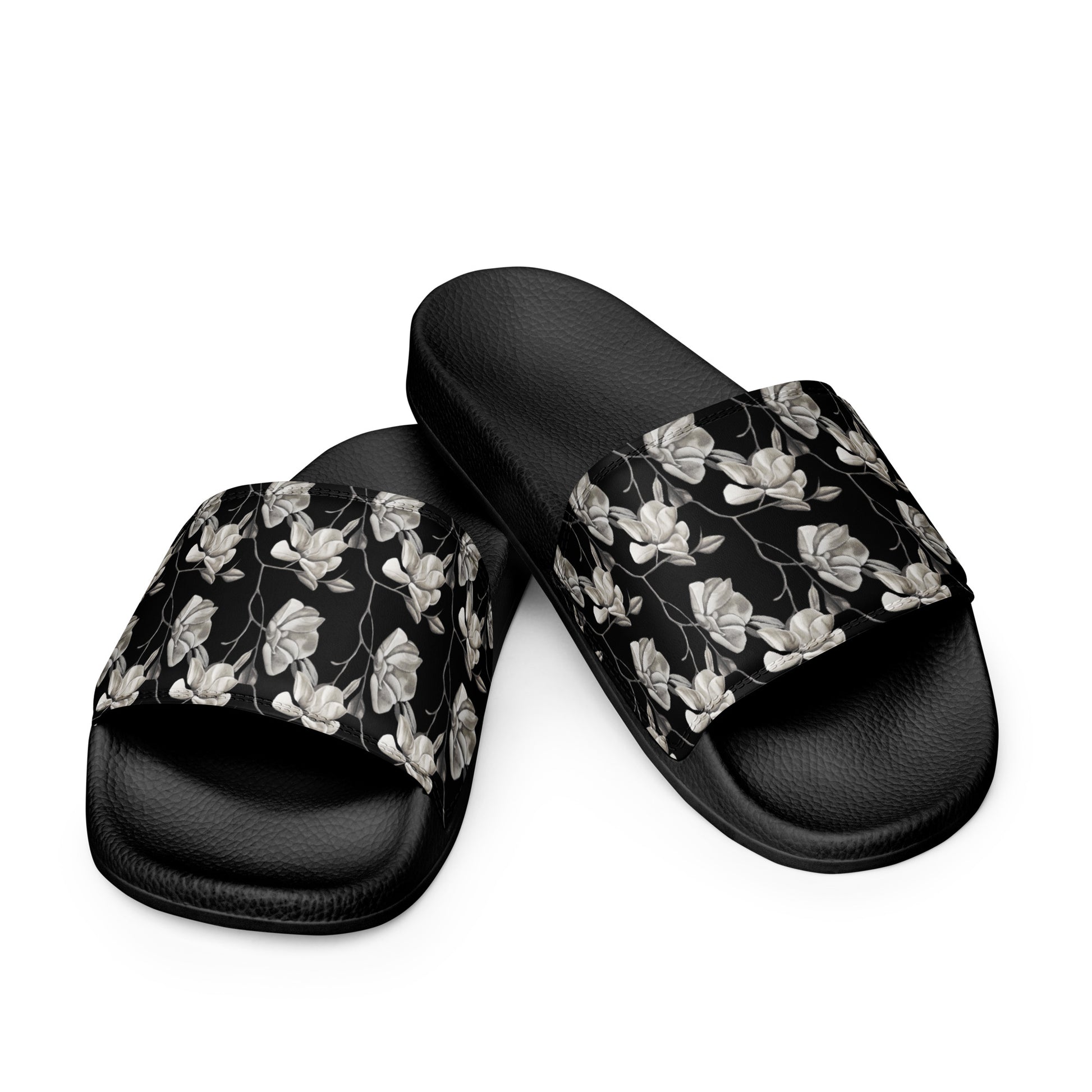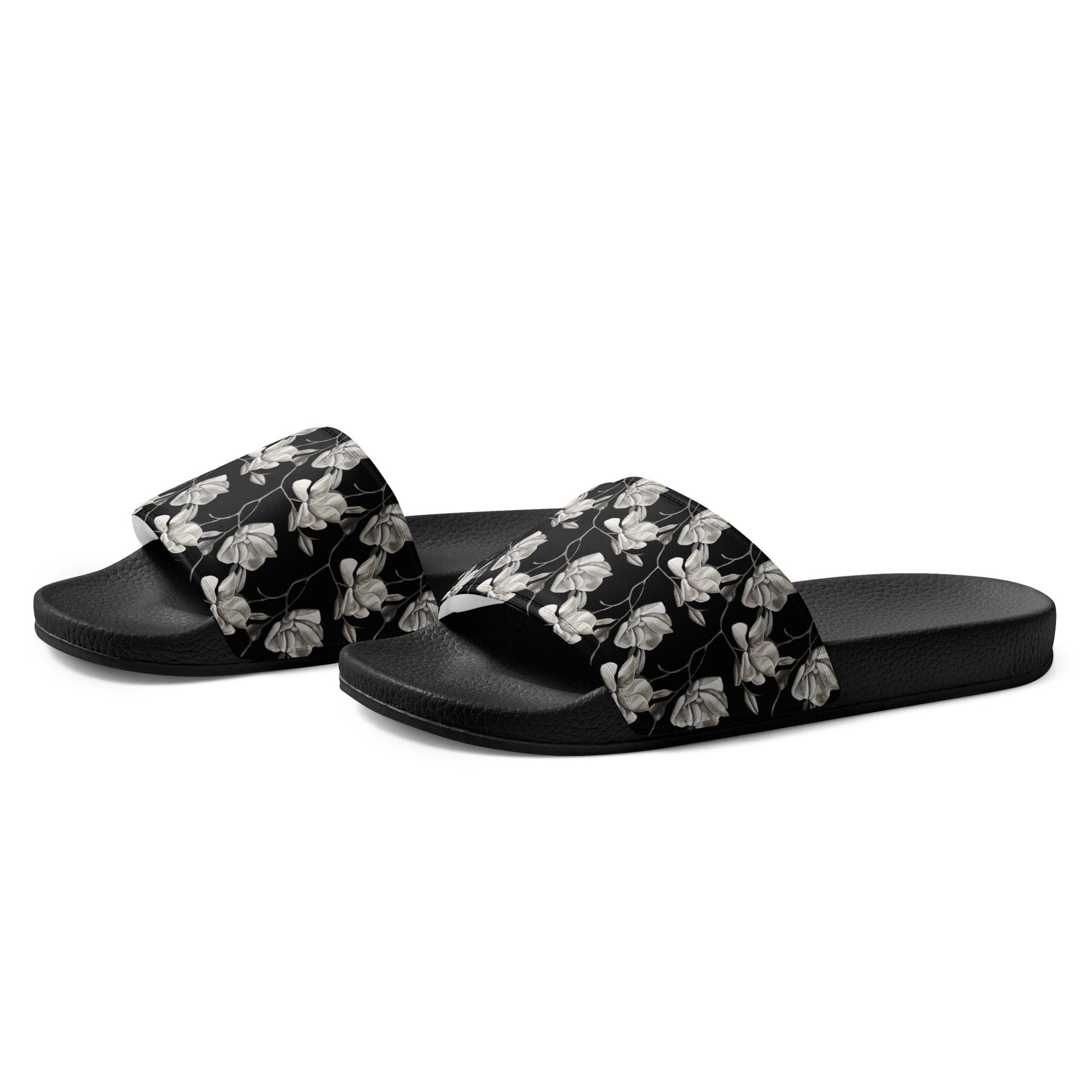 Women's Slides - Midnight Magnolias - Monochrome Black and White Floral Artwork Design Sandals, Wearable Art Shoes