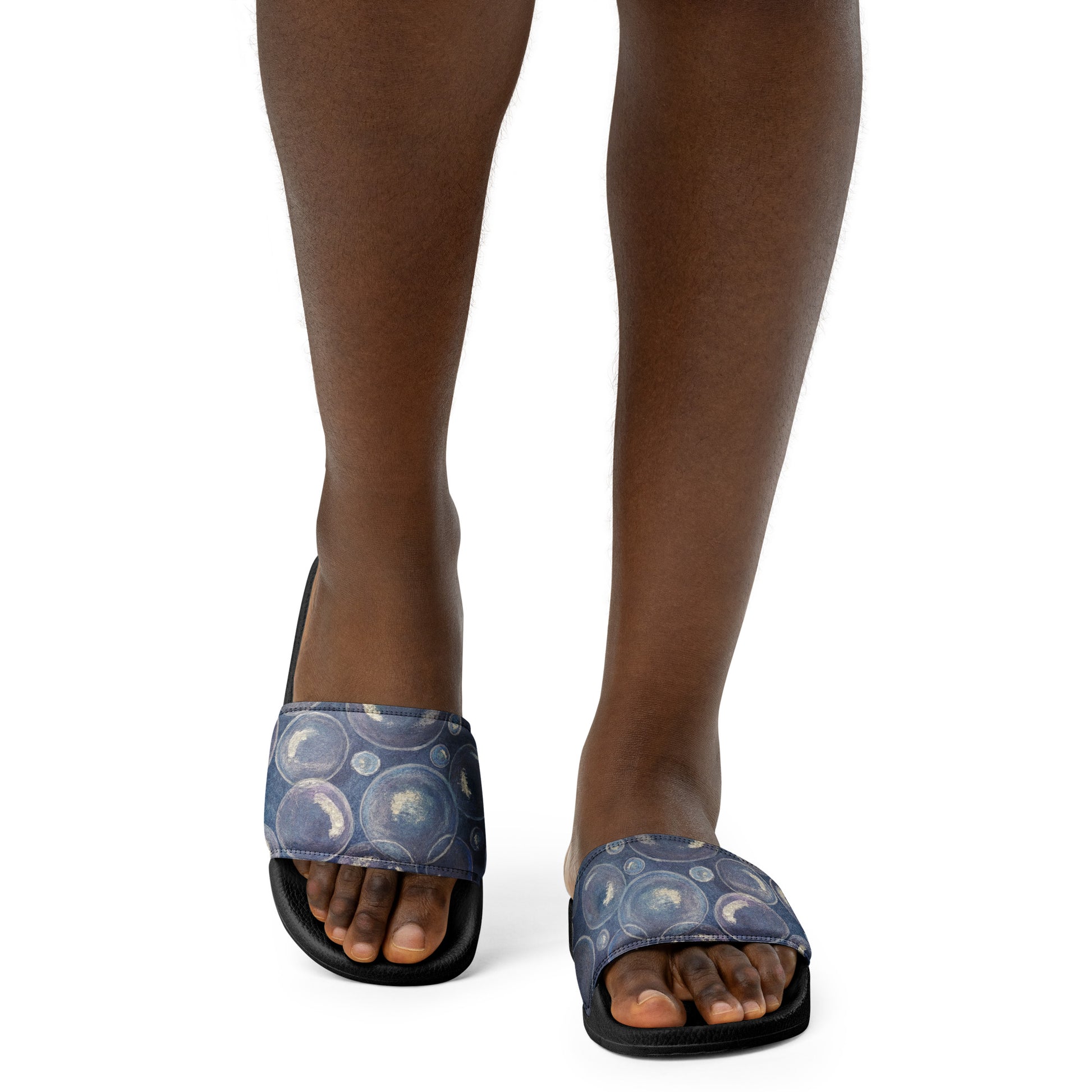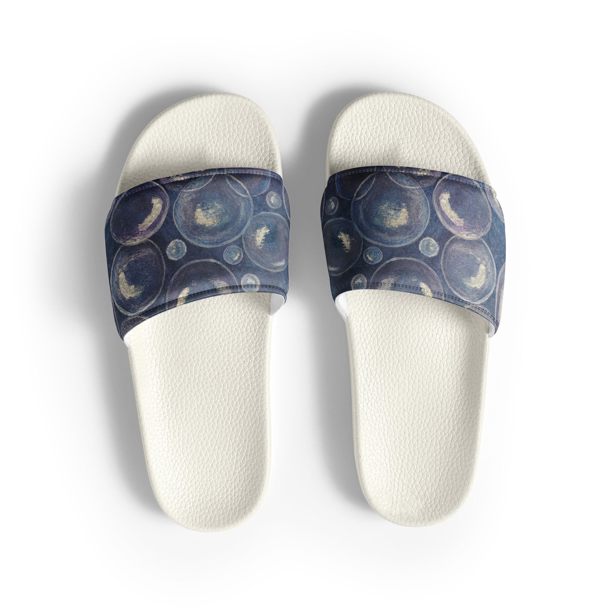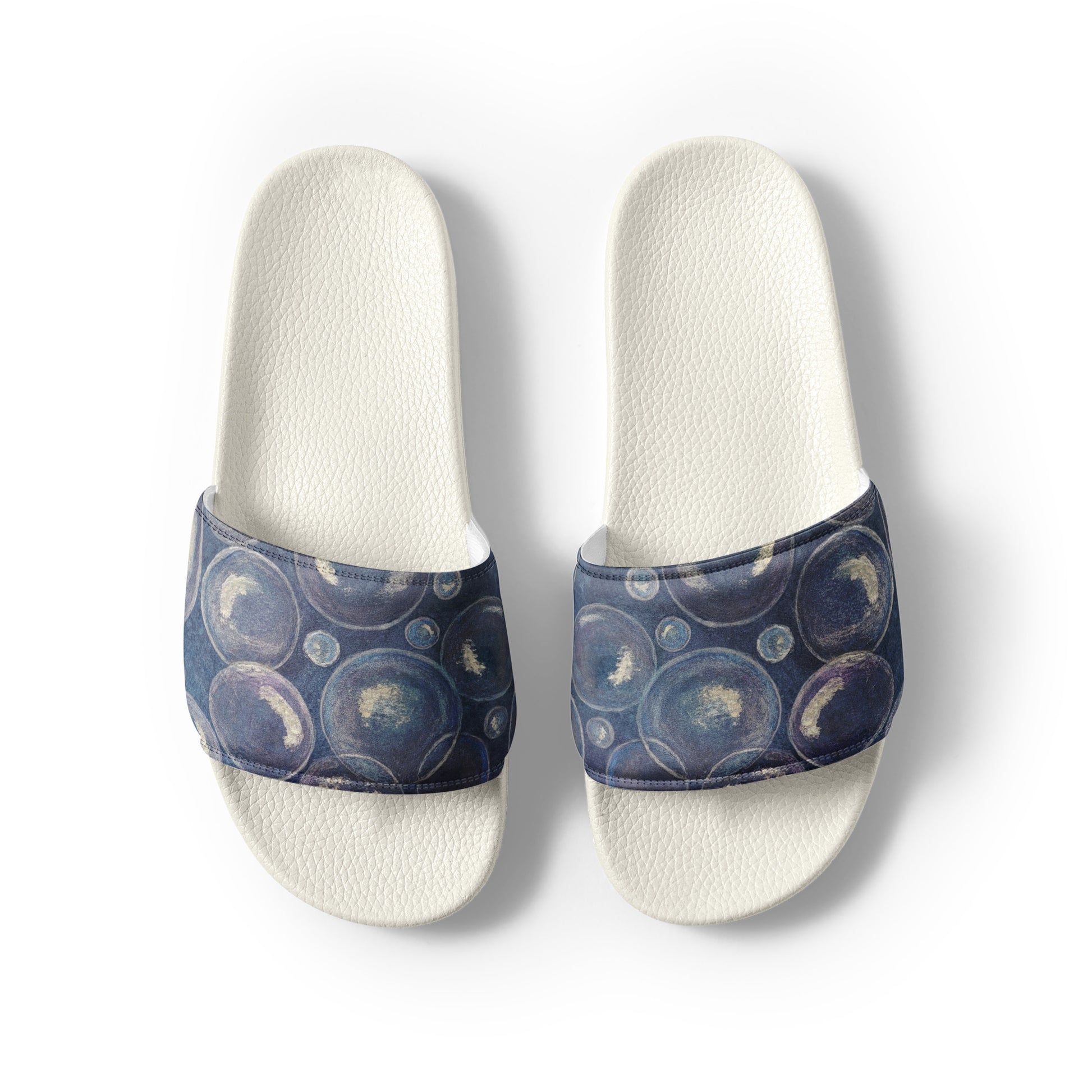 Women's Slides - Tranquil Reflections - Colorful Blue and White Bubble Artwork Design Sandals, Wearable Art Shoes